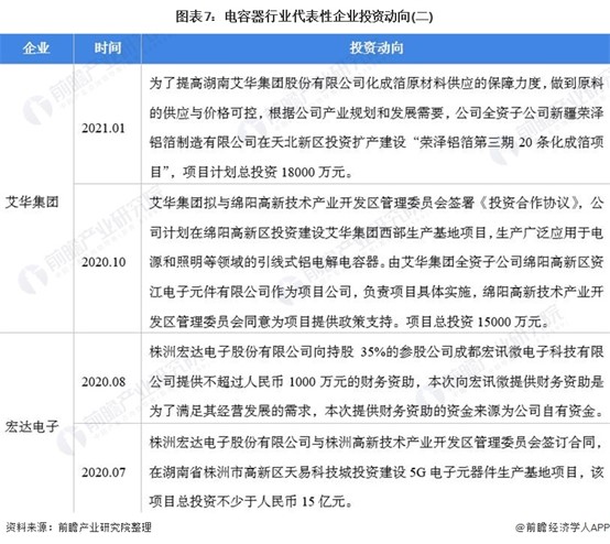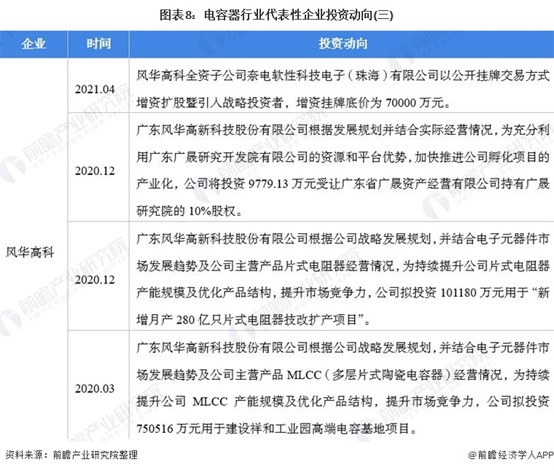 2020年以来,电容器行业代表性企业的投资动向主要包括收购公司拓展业务、通过对子公司增资的方式投资电容器生产基地项目。电容器行业代表性企业最新投资动向如下: