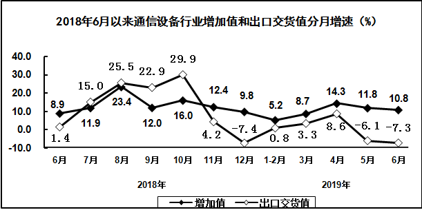 上半年,通信设备制造业增加值同比增长9.6%,出口交货值同比下降0.1%。主要产品中,手机产量同比下降6.9%,其中智能手机产量同比下降4.8%。