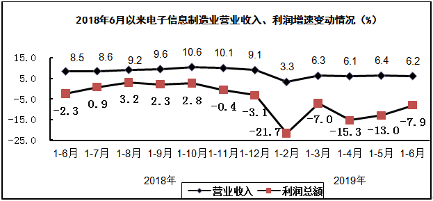 上半年,规模以上电子信息制造业营业收入同比增长6.2%,利润总额同比下降7.9%,营业收入利润率为3.8%,营业成本同比增长6.1%,应收票据及应收账款同比增长5.3%。