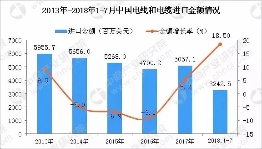 2013年-2016年中国电线和电缆进口金额逐渐下降,2016年中国电线和电缆进口金额为4790.2百万美元,同比下降9.1%。2017年中国电线和电缆进口金额增长;2018年1-7月中国电线和电缆进口金额为3242.5百万美元,同比增长18.5%。