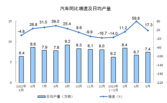 分产品看,5月份,620种产品中有339种产品产量同比增长。其中,钢材11847万吨,同比下降1.3%;水泥19638万吨,下降0.4%;十种有色金属615万吨,增长5.1%;乙烯262万吨,增长7.1%;汽车230.7万辆,增长17.3%,其中新能源汽车67.5万辆,增长43.6%;发电量6886亿千瓦时,同比增长5.6%;原油加工量6200万吨,同比增长15.4%。